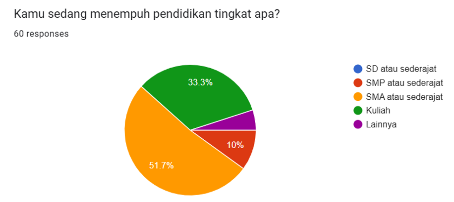 Latar belakang responden pada penelitian ini tertinggi adalah SMA atau sederajat, sebanyak 51,7% atau 31 orang, dan disusul dengan responden yang sedang menempuh pendidikan di tingkat universitas yaitu 33,3% atau 20 orang, dan SMP atau sederajat sebanyak 10% atau 6 orang. Hal ini menunjukkan bahwa mayoritas responden berada pada masa remaja hingga dewasa muda, yaitu kelompok usia yang berada dalam fase perkembangan identitas diri dan pembentukan pemahaman mengenai tubuh, gender, dan relasi.