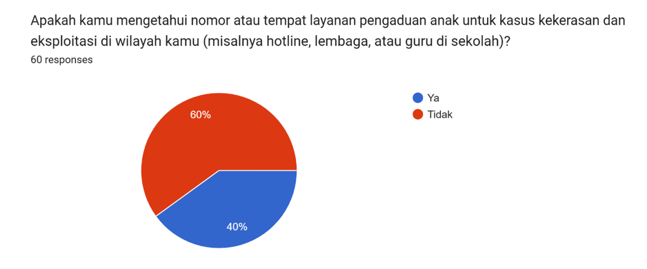 Sebanyak 51,7% responden menyatakan bahwa mereka tidak mengetahui layanan atau tempat konsultasi tentang HKSR yang aman. Hal ini juga sama dengan layanan pengaduan kasus kekerasan, sebanyak 60% responden mengatakan bahwa mereka tidak mengetahui layanan pengaduan anak jika terjadi kasus kekerasan dan eksploitasi. Sementara itu, 78,3% responden mengaku pernah terpapar konten seksual di internet. Temuan ini menunjukkan adanya celah serius layanan konsultasi dengan risiko konten anak di ranah dalam jaringan. Risiko eksploitasi seksual online bukan hanya potensi, melainkan kondisi nyata dalam kehidupan digital. Anak-anak menghadapi informasi seksual di internet sebelum mereka dibekali pengetahuan dan dukungan yang memadai.