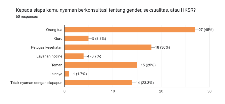 Hal ini diperkuat oleh data tingkat kenyamanan anak untuk membicarakan seksualitas dan kesehatan reproduksi mereka. Hasil kajian menunjukkan bahwa komunikasi yang dilakukan oleh anak dan orang muda tertinggi adalah bersama orang tua (45%), diikuti petugas kesehatan (30%), dan teman (25%). Jumlah anak yang merasa tidak nyaman dengan siapapun juga memiliki angka yang cukup tinggi (23,3%). Temuan ini menunjukkan bahwa anak dan orang muda belum memiliki ruang komunikasi yang aman dan suportif dalam membicarakan persoalan tubuh dan seksualitas.