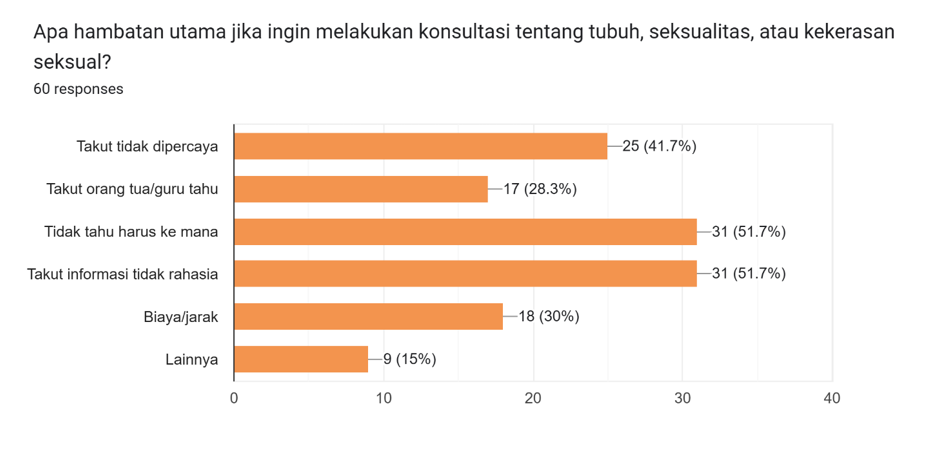 Selain layanan ruang konsultasi aman mengenai seksualitas yang masih belum dapat diakses secara merata oleh anak, hambatan terbesar lainnya adalah norma sosial dan relasional, khususnya rasa takut dihakimi. Anak terbiasa dengan pemahaman bahwa gender dan seksualitas adalah hal yang tabu. “Di masyarakat, topik gender dan seksualitas sering dianggap tabu atau tidak pantas dibicarakan. Hal ini membuat anak merasa takut bertanya atau berpikir bahwa topik itu salah untuk dipelajari,” jelas G, perempuan, 14 tahun.